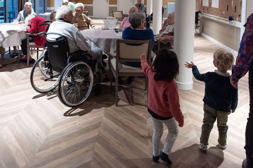 Dans un Ehpad de Saint-Ouen, en Seine-Saint-Denis, une initiative originale favorise les rencontres intergénérationnelles. Deux fois par mois, des personnes âgées venant de l’Ehpad public Lumières d’automne se réunissent avec de jeunes enfants de la crèche parentale Les petits bourgeons, située dans le même bâtiment.